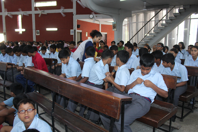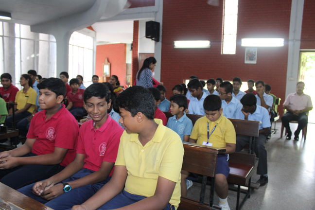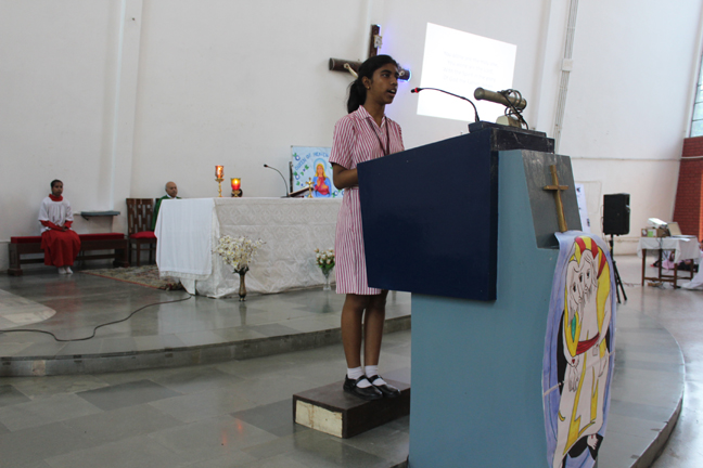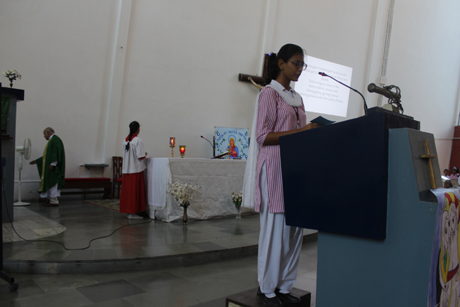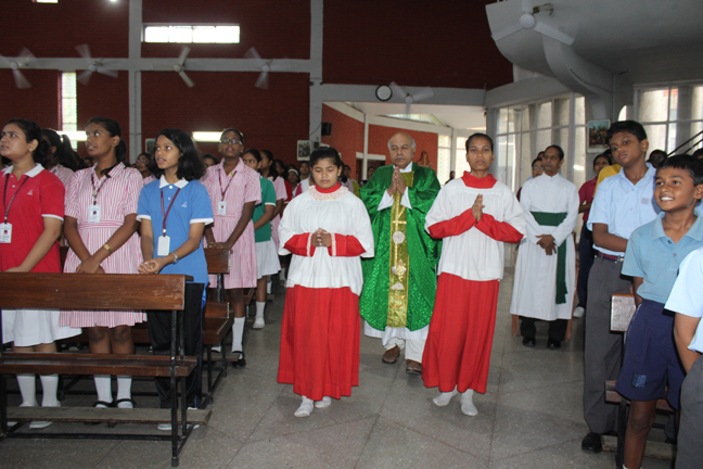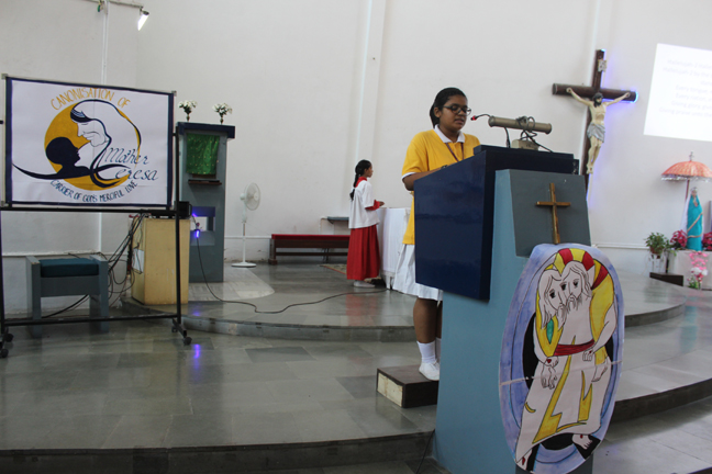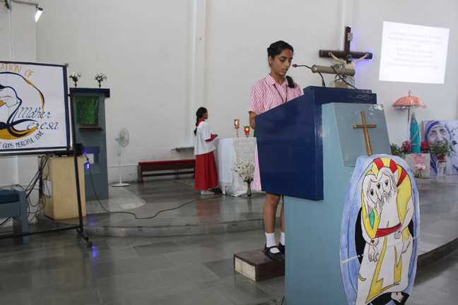 Fr. Arnold reflected on the importance of teachers in our lives. He also emphasized the need of intercession through Mary, our Blessed mother. The students of Junior School sang the song on Mother Teresa, composed by Usha Uthup and the senior school sang the official song of Mother Teresa, ‘Come Be My Light’. The miraculous medal of Mother Teressa was distributed to all the students and teachers who attented the Holy Eucharist.