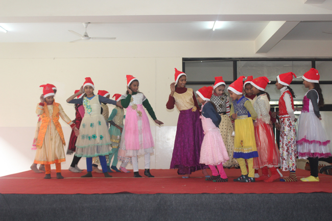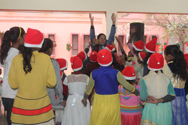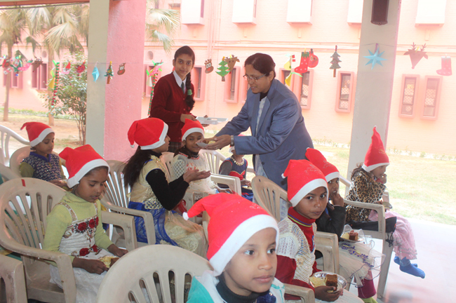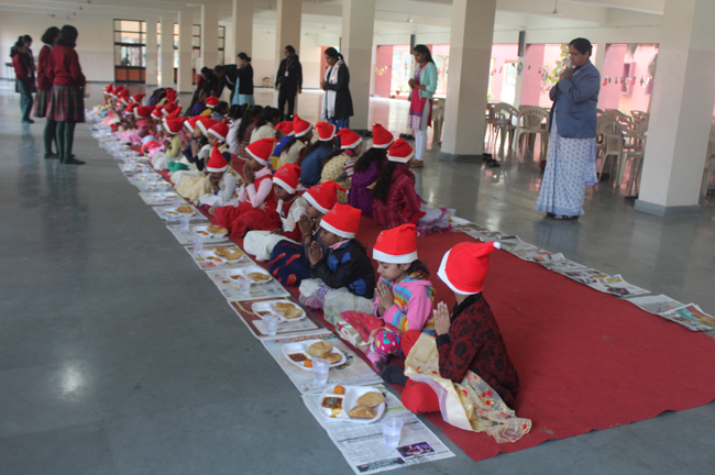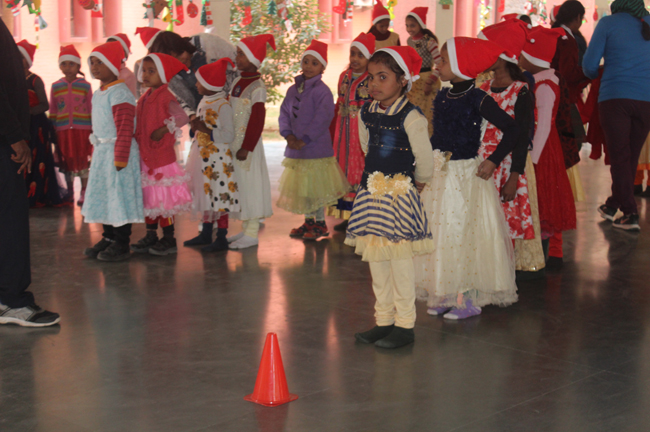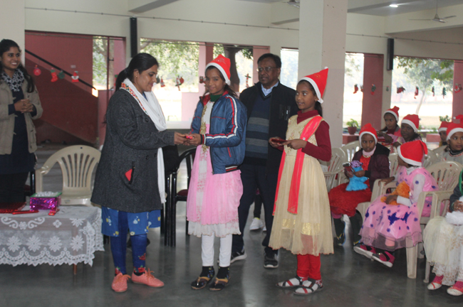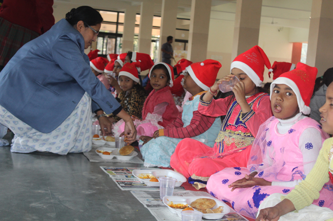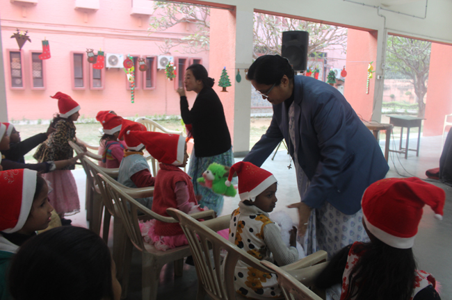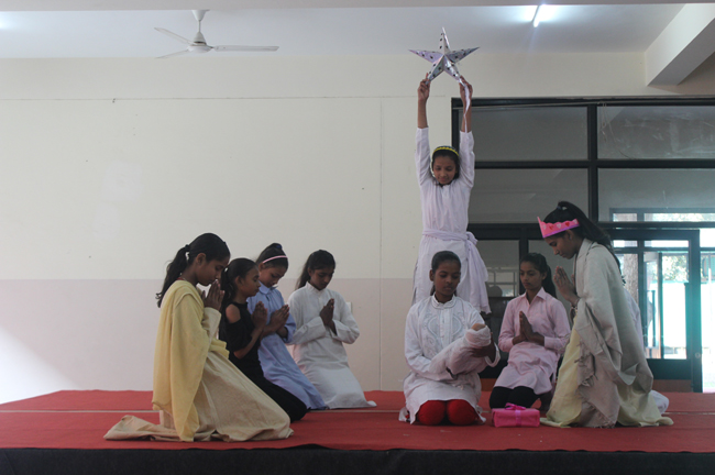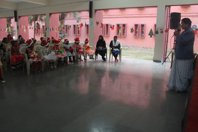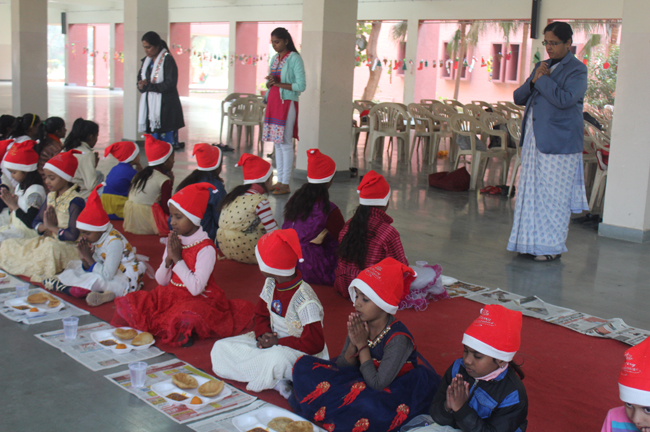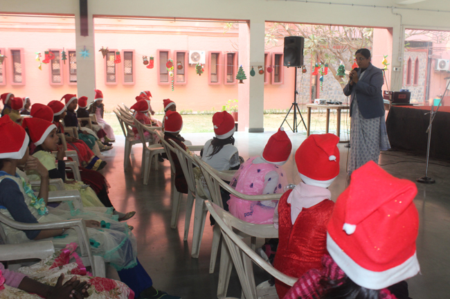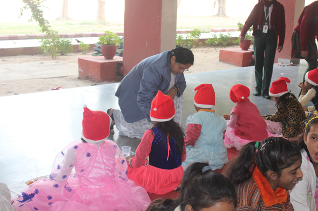 Description: The students of Class 8 and 10 of Loreto Convent School, Delhi Cantt hosted Christmas Celebrations for the Jeevan Rekha students in the evening classes conducted for the underprivileged children of the nearby Jharera village. The event headed by the esteemed principal, Sr. Archana and the coordinators Mrs. Priya Nasir and Mrs. Simi Joseph and Mrs. Leena Mathew, commenced at 2: 30 pm when the children were welcomed and each was presented with a Santa Claus cap. The children were given refreshments of cake and juice. The programme began with a short and meaningful prayer service. This was followed by an enthralling play depicting the Nativity presented by the students of Class 8. The students presented hymns and songs under the guidance of Mrs. Ghoshal. The students of Jeevan Rekha too presented a prayer dance, the festivity of Christmas on the song Silver Bells, and a tableau on Nativity on the song ‘Do you see what I see’. Mrs. S. Aggarwal and Mr. Minhas conducted sports competitions for the children and prizes were given to the winners by the Principal, Sr. Archana. Refreshments of a scrumptious plate of Puri - Chana and Laddu were provided. Each child of the Jeevan Rekha Programme was gifted with a bountiful hamper. Sr. Archana addressed the children with greetings and good wishes for the season. She encouraged the children to study well and emphasized on the need to grow into good human beings. The programme ended at 4: 30 pm.