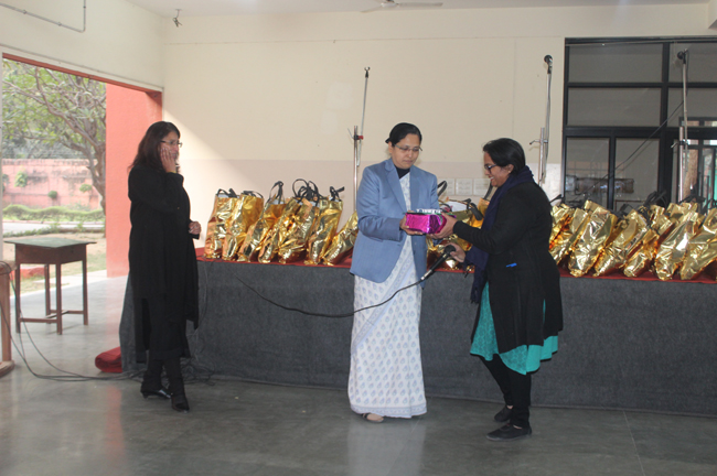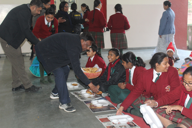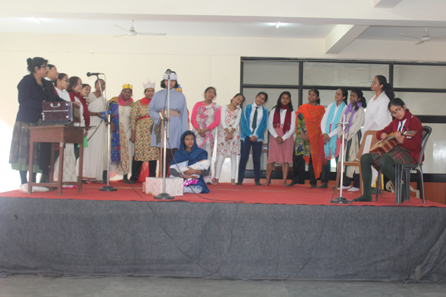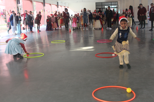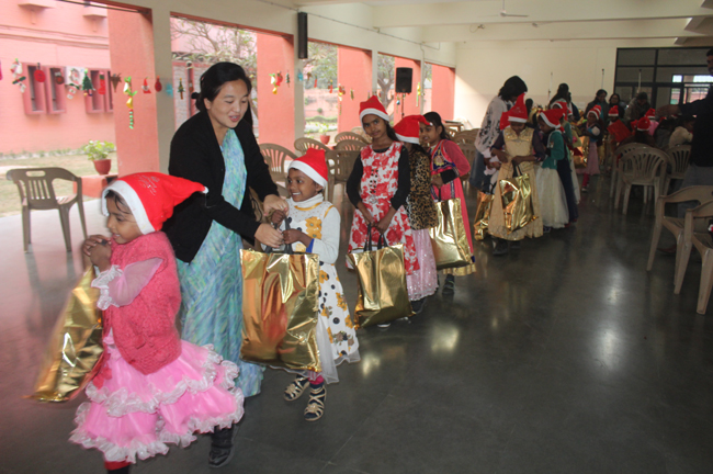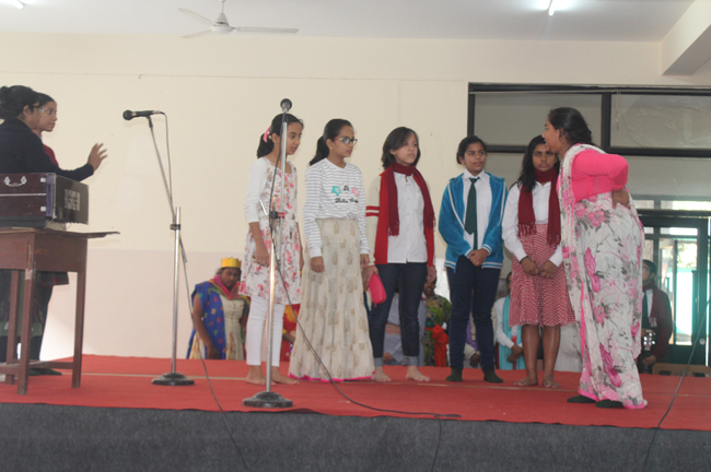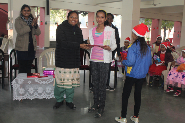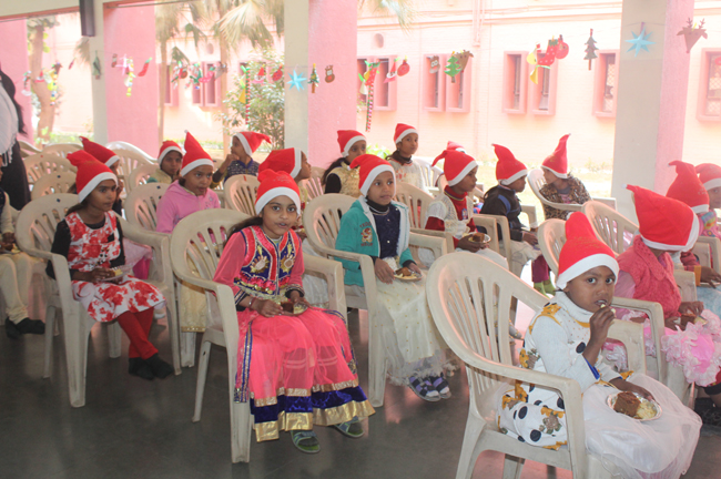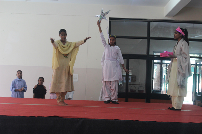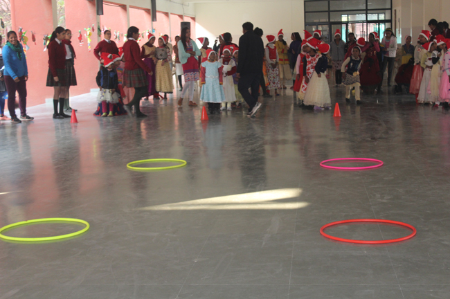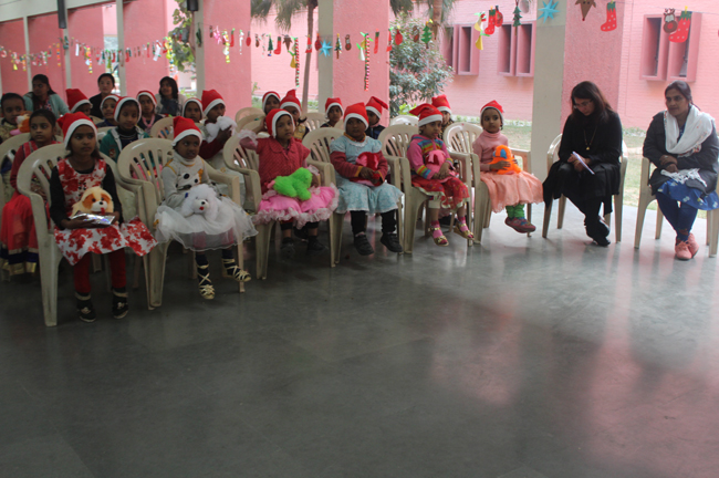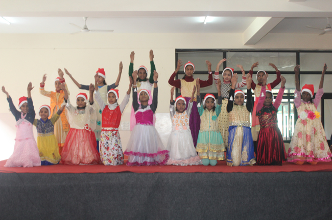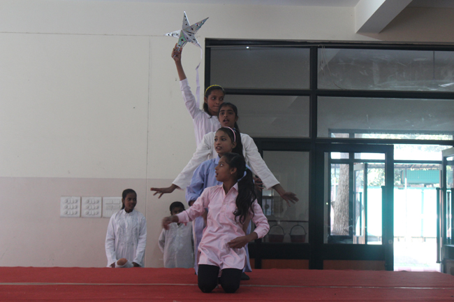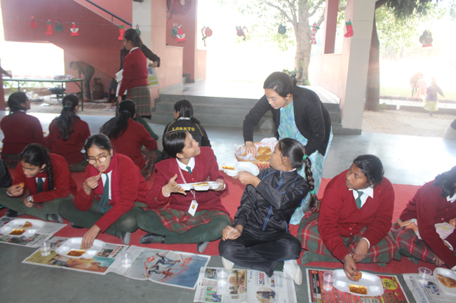 Description: The students of Class 8 and 10 of Loreto Convent School, Delhi Cantt hosted Christmas Celebrations for the Jeevan Rekha students in the evening classes conducted for the underprivileged children of the nearby Jharera village. The event headed by the esteemed principal, Sr. Archana and the coordinators Mrs. Priya Nasir and Mrs. Simi Joseph and Mrs. Leena Mathew, commenced at 2: 30 pm when the children were welcomed and each was presented with a Santa Claus cap. The children were given refreshments of cake and juice. The programme began with a short and meaningful prayer service. This was followed by an enthralling play depicting the Nativity presented by the students of Class 8. The students presented hymns and songs under the guidance of Mrs. Ghoshal. The students of Jeevan Rekha too presented a prayer dance, the festivity of Christmas on the song Silver Bells, and a tableau on Nativity on the song ‘Do you see what I see’. Mrs. S. Aggarwal and Mr. Minhas conducted sports competitions for the children and prizes were given to the winners by the Principal, Sr. Archana. Refreshments of a scrumptious plate of Puri - Chana and Laddu were provided. Each child of the Jeevan Rekha Programme was gifted with a bountiful hamper. Sr. Archana addressed the children with greetings and good wishes for the season. She encouraged the children to study well and emphasized on the need to grow into good human beings. The programme ended at 4: 30 pm.